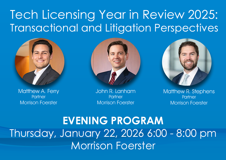 Attorneys from Morrison Foerster’s Technology Transactions and IP Litigation groups will share updates and new case law impacting technology licensing strategies. Presenters: Matthew Ferry - Partner, John Lanham - Partner, Matthew Stephens - Partner, Morrison, Foerster Date:  Thursday, January 22, 2026 Time: 6:00 - 7:00 pm networking and heavy appetizers, 7:00 - 8:00 p.m. [...]